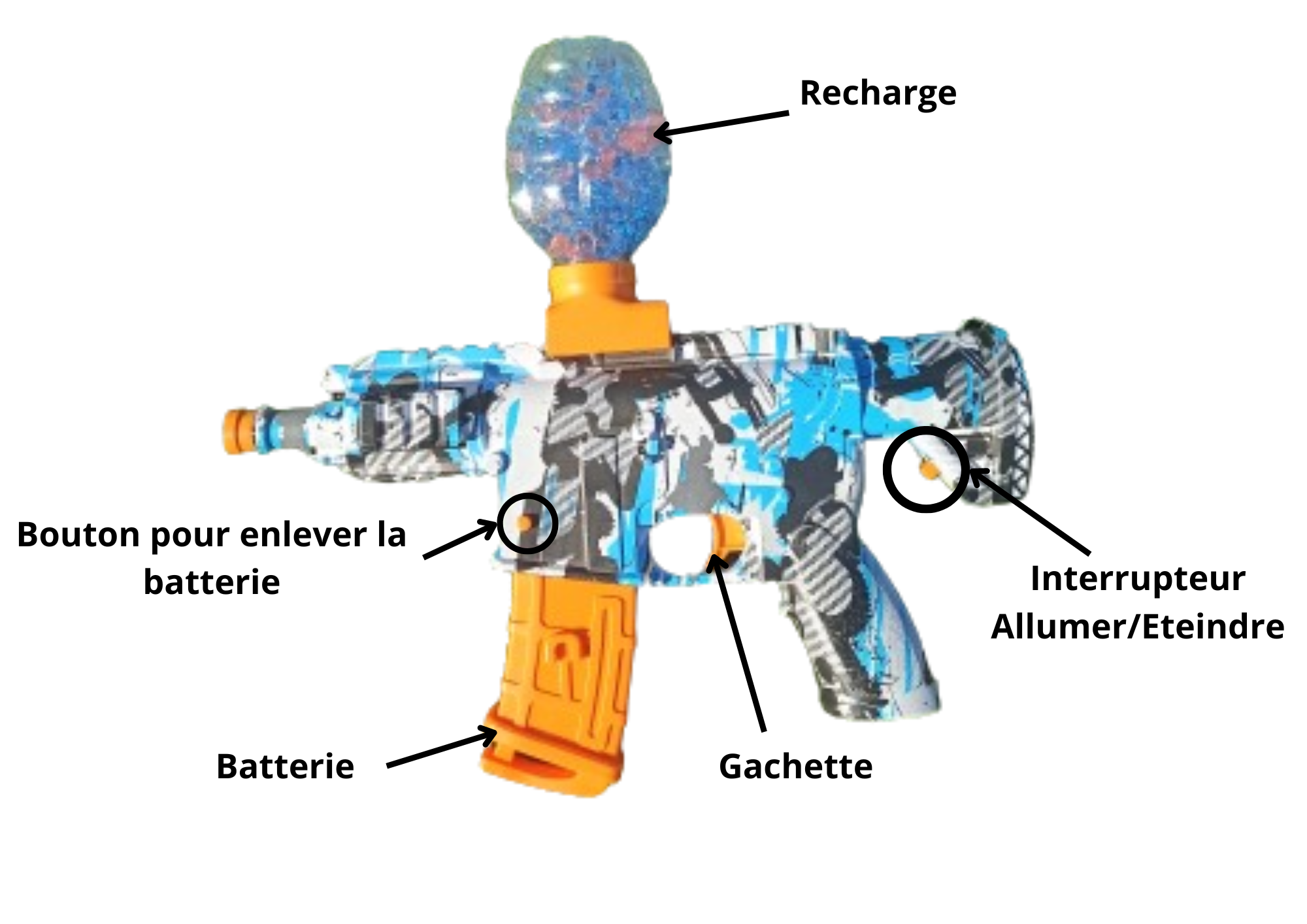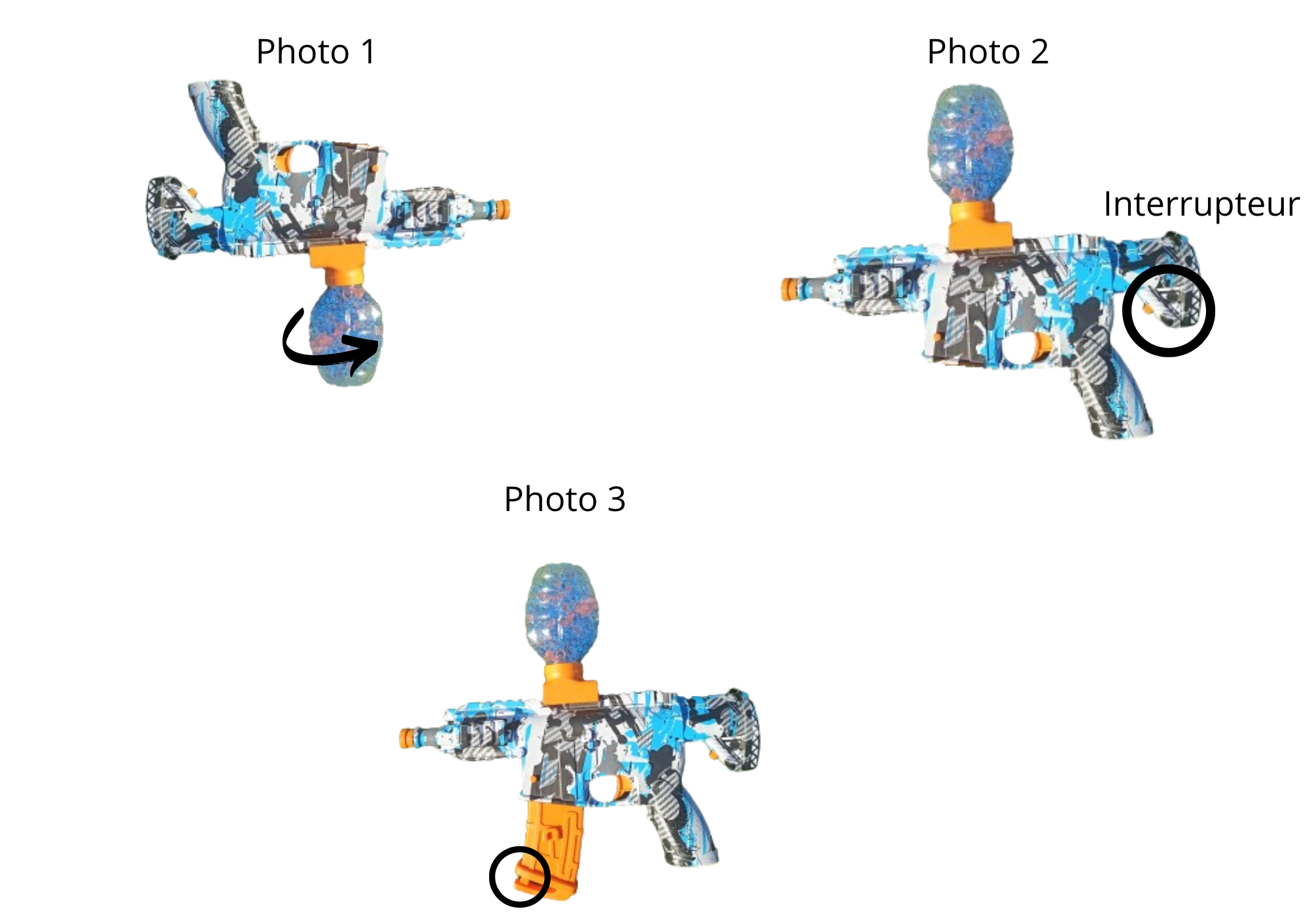 1) Visser une recharge de billes sur le pistolet : retourner le pistolet (photo 1)